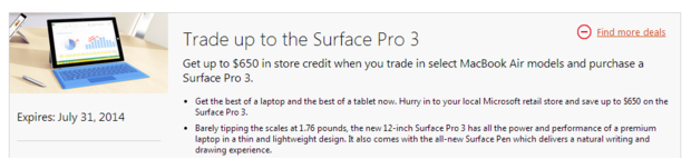 Microsoft a lancé une campagne promotionnelle outre-Atlantique, qui s’achèvera le 31 juillet 2014, pendant laquelle l’entreprise se propose d’échanger un MacBook Air contre une ristourne ; jusqu’à 650 dollars de ristourne pourra être accordée aux propriétaires d’ultrabook pour les aider à migrer vers le Surface Pro 3. Les MacBook Air devront néanmoins être fonctionnels, sans écrans brisés mais ne devront également pas avoir subi de dégâts à cause de l’humidité. Notons que Microsoft limite les transactions à une machine pour un achat : il n’est donc pas possible de ramener plusieurs MacBook Air pour s’offrir un Surface Pro 3 et ainsi parvenir à ne pas débourser d'argent.