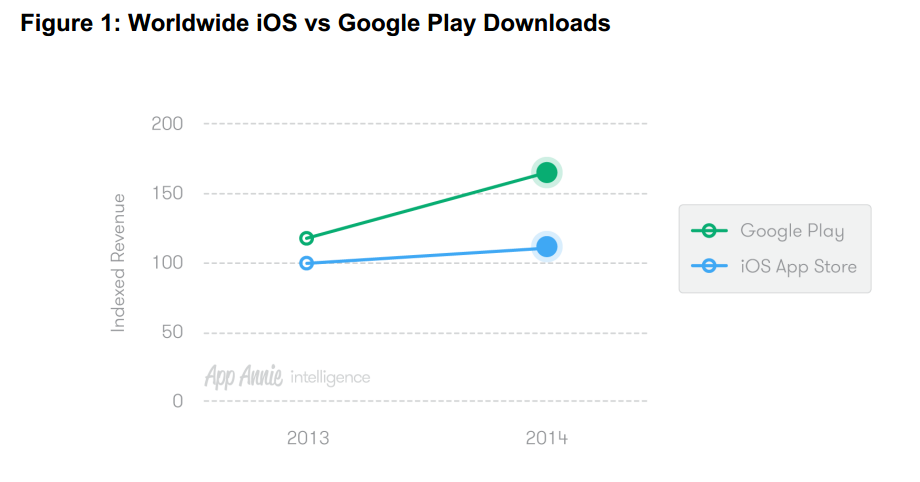 L'écart entre le nombre de téléchargements effectués sur Google Play et sur l'App Storea plus que doublé en 2014