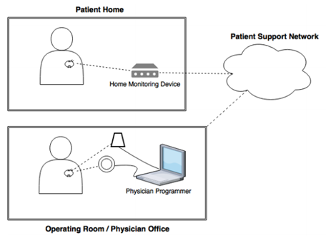 Comme le soulignent les chercheurs de la firme WhiteScope, les stimulateurs cardiaques s’insèrent dans un écosystème (cf. image ci-dessus). Indépendamment du constructeur, cet écosystème compte essentiellement quatre composantes : le stimulateur cardiaque lui-même, le programmateur (cf. Physician Programmer, image ci-dessus), le dispositif de prise d’informations à distance (cf. Home Monitoring Device, image ci-dessus) et l’infrastructure Web associée.