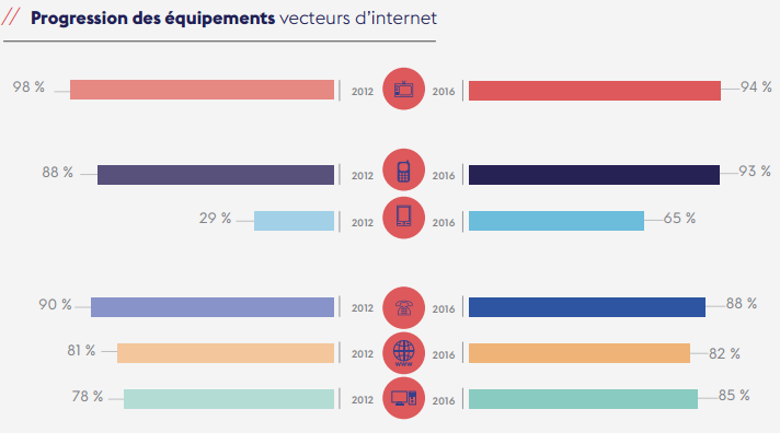 L’ARCEP note qu’en 2016, le taux d’équipement en terminaux d’accès à internet est en passe de rattraper, et bientôt de dépasser, celui des principaux vecteurs d’information et de communication actuels : le téléviseur et le téléphone classique (limité aux services de téléphonie). Ainsi, 82 % des Français disposent désormais d’un ordinateur à leur domicile et 85 % bénéficient d’un accès à internet fixe, soit un niveau d’équipement presque équivalent à celui du téléphone fixe (88 %). En matière de mobile, 92 % des Français possèdent leur propre terminal mobile, dont deux tiers de smartphones.