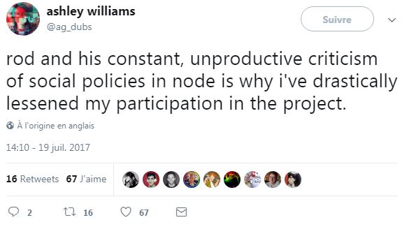 Un nombre croissant de contributeurs accusent le Comité de direction technique d'ignorer les violations répétées du code de conduite, notamment avec Rod qui ne serait pas à son premier comportement du genre. Dans un tweet, Ashley Williams, Operations Engineer de npm Inc., a déclaré que « Rod et sa critique constante et improductive des politiques sociales dans le projet Node est la raison pour laquelle [elle] a considérablement réduit [sa] participation au projet ». Et d'ajouter qu'elle « [sait] avec certitude que ses actions ont également affecté la participation de nombreux autres contributeurs et des potentiels contributeurs. »