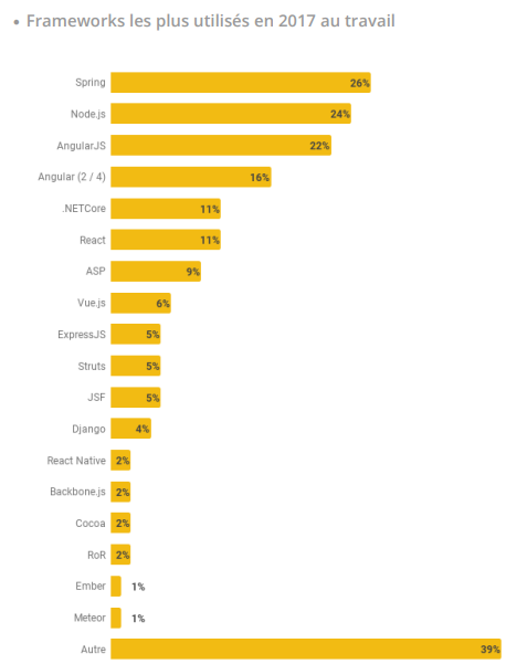 En ce qui concerne les frameworks, le trio des plus utilisés au travail en 2017 est composé de Spring, Node.js et AngularJS.