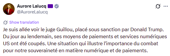 « Pourquoi je suis allé le voir ? Parce qu’il a été mis sous sanction par Donald Trump lui-même parce que les décisions qu’il a prises ont déplu à Donald Trump. Concrètement qu’est-ce que ca veut dire ? Qu’il ne peut plus effectuer de paiements. Ca veut dire qu’il est quasiment interdit bancaire. Ca veut dire qu’il ne peut plus commander quoi que ce soit sur Internet. Ca veut dire qu’il ne peut plus louer une chambre d’hôtel, qu’il ne peut plus accéder à des plateformes de streaming, etc. Si je vous en parle aujourd’hui, c’est parce qu’au-delà du cas gravissime de ce qui arrive au juge Guillou, en fait, ce qui lui arrive pourrait arriver à chacun de nous. Pourquoi ? Parce qu’on est dépendants sur absolument tout : nos infrastructures numériques, nos infrastructures de paiement, etc. On ne le sait pas, mais par exemple, quand vous payez cela passe en fait par des infrastructures américaines, que ce soit par carte bancaire, par Apple Pay, etc. Sur tout on est dépendants des Américains et cela nous rend extrêmement vulnérables. Donc ce cas là est extrêmement grave sur le principe déjà, mais il est extrêmement grave parce qu’il illustre à merveille la vulnérabilité de l’Union européenne, de ses citoyens vis-à-vis des Américains et de l’Amérique de Donald Trump qui peut couper le robinet du jour au lendemain et changer radicalement notre quotidien », ajoute-t-elle avant de préciser que l’une des solutions réside dans le lancement de l’Euro numérique.