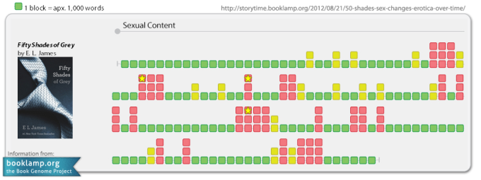 En plus, Booklamp peut également analyser le rythme et la densité de certains thèmes à l’instar des contenus sexuels explicites. Ci-dessous un autre diagramme proposé par Digital Book World qui utilise les données de Booklamp sur « 50 Shades of Grey » qui commence sans en faire usage mais fait appel par intermittence à des scènes plus ou moins explicites, le degré étant représenté sur le diagramme.